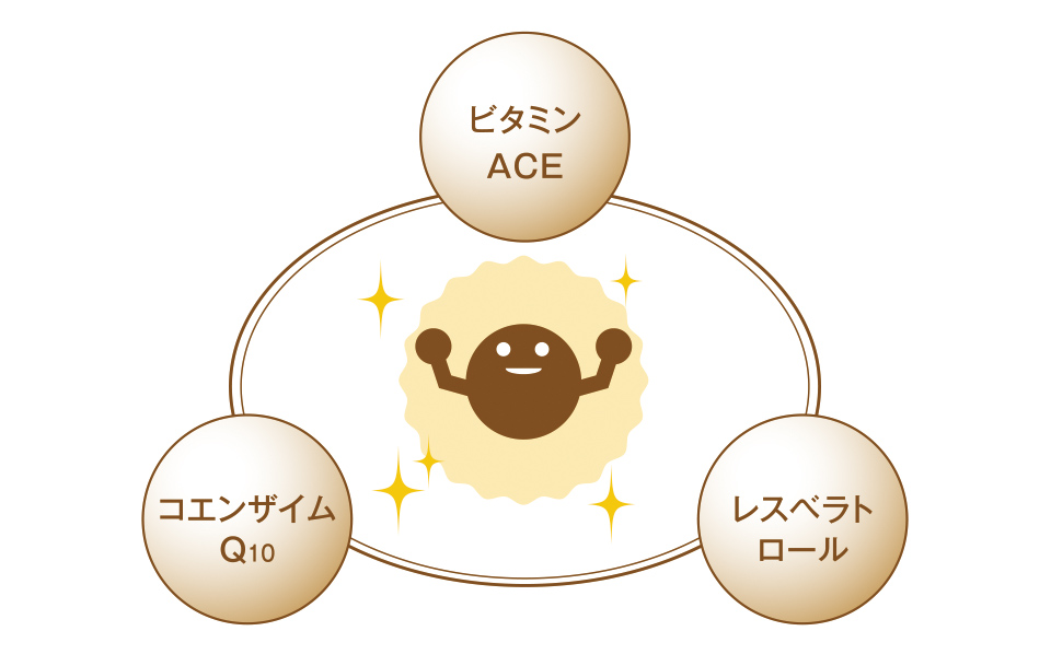 2.NADの損失を防ぐ 私たちの体は、日々「サビつき」によるダメージにさらされています。実は、細胞がダメージを受けると、その修復のためにNADが大量に消費されてしまうのです。そこで重要になるのが、細胞自体を健やかに保ち、「サビつき」ダメージから守ること。私たちは、コエンザイムQ10、レスベラトロール、そしてβカロテン(ビタミンA)・ビタミンC・Eといった、細胞を支える成分を組み合わせました。NADをムダに消費させないために― 守るチカラも、同時に届ける必要があると私たちは考えています。